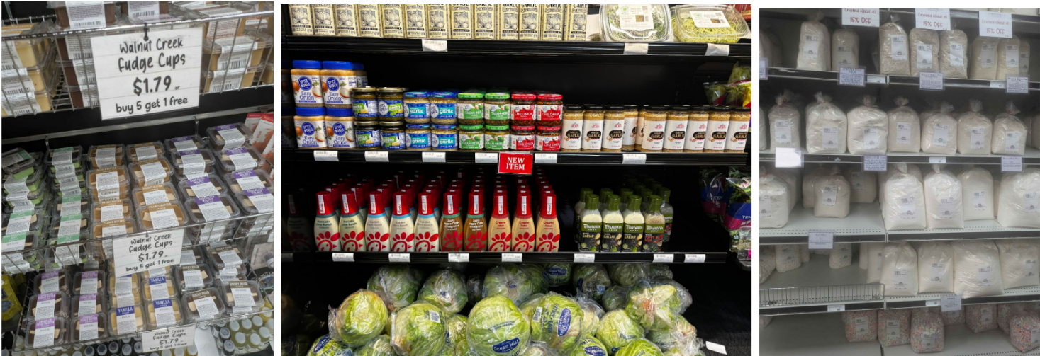 The second location is the Walnut Creek Cheese and Market. The offsite store employs and serves both the Amish and non-Amish residents around the area. Many of the products are from Amish makers, and many have Walnut Creek branding. But there are other products being sold from larger brand names. Groceries are packed in single-use plastic bags, and there was a lot of single-use packaging around the store. Even the Amish-made products use more plastic and boxes in their packaging. This is a big shift from the farm kitchen where glass jars were reused for storing the workers food. This mimics the normalized practices in grocery stores.