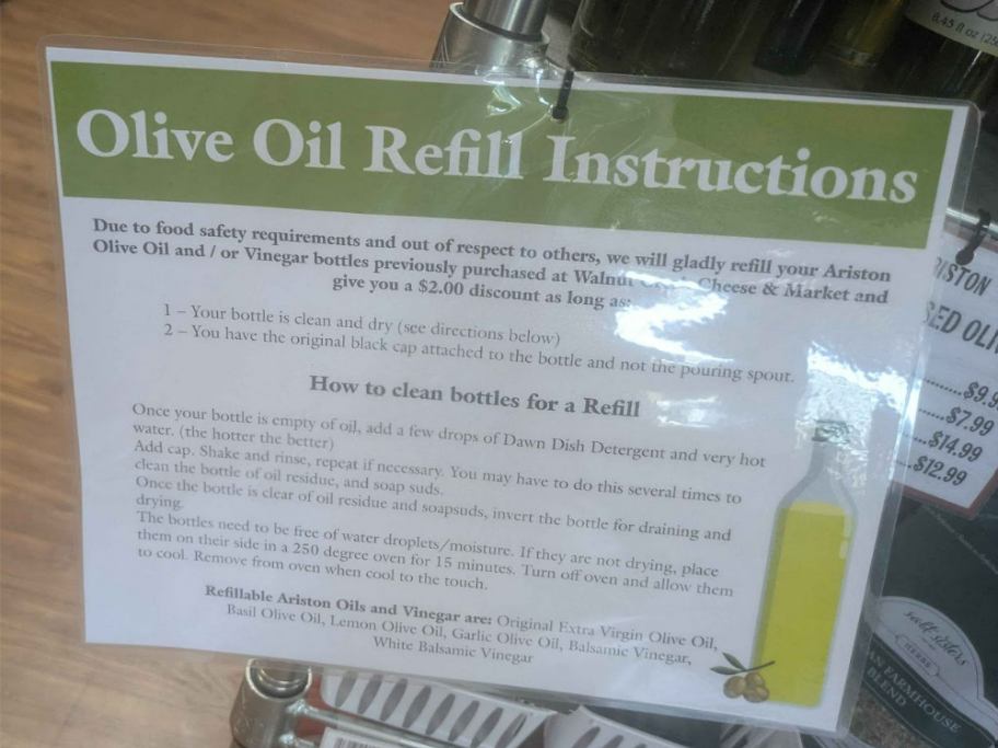 Finally, some of their artisan oils and vinegars offer refills with a two dollar discount if the customer brings back a clean bottle. This is especially interesting because the bottle must be from their product, making this very circular in nature.