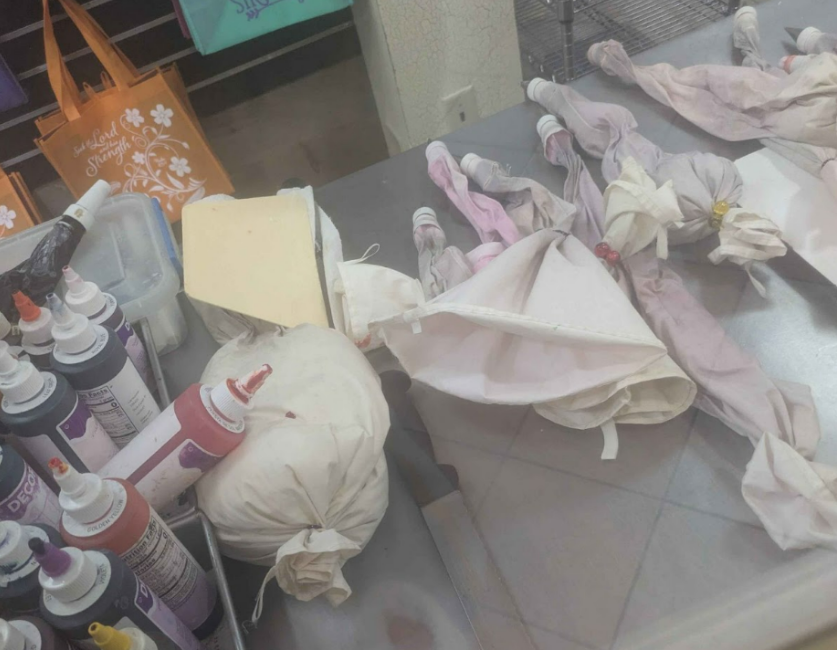 Some practices still have uniquely reusable materials. These piping bags being used to decorate icing onto cakes are made of reusable cloth. Once cleaned properly, they can be used again. This is very different compared to the usual one-use plastic bags that are discarded in large scale markets.