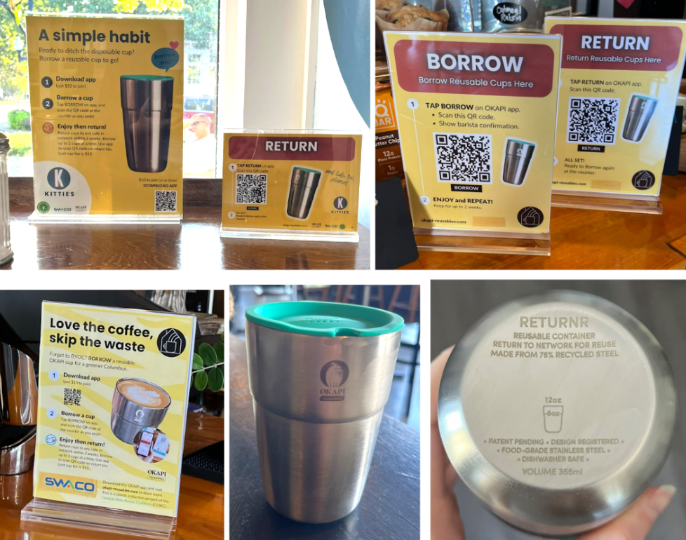 While researching current initiatives towards circularity locally, I found out that since this past January, Columbus is part of a pilot program to reduce the amount of single use coffee cups from cafes. In partnership with Okapi Reusables, currently 9 cafes across Columbus are testing out their program to encourage using metal tumblers instead of the single use cups coffee orders usually get placed in. Participants are asked to download the app, and then there is a one time $10 fee to get started using their cups. They base it off of a library borrowing system where you get two weeks to return the tumbler that you most recently used. By scanning a QR code at the time of ordering you are able to get up to two reusable tumblers at a time which makes it convenient if you already have one checked out and forgot to bring it back. Once your drink is in the cup, you are then asked to wash it initially before scanning the QR code to turn it back in at any of the participating cafes return bins. However the cafes then wash them on their end too before going back into circulation. I thought that this program would be an interesting way to do participant observation to fully get a grasp on how the process goes from start to finish while also informally engaging in a few casual interview questions.