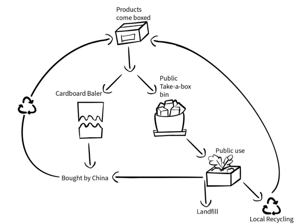 Boxes are generated from shipping in products, and these mostly go to the in-house cardboard baler. The condensed cardboard is bought by Chinese companies and eventually used to make boxes for American products. But there is another offshoot created by the unique take-a-box system where customers can take boxes, often for carrying groceries home, storing plant materials, moving, or anything else. The boxes from this branch have a wider reach, but presumably some are locally, or globally recycled, while many may end up in a landfill. Despite all the offshooting branches to this system, there is still a slight circularity emerging.