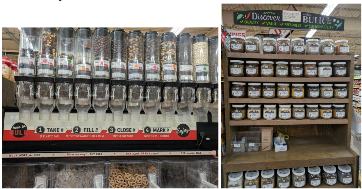 All of these systems allow customers to bring their own containers, which reduces the use of plastic. Additionally, customers choose the amount of product they want to buy. This can help limit food waste, as people are not forced into buying more than they can finish.