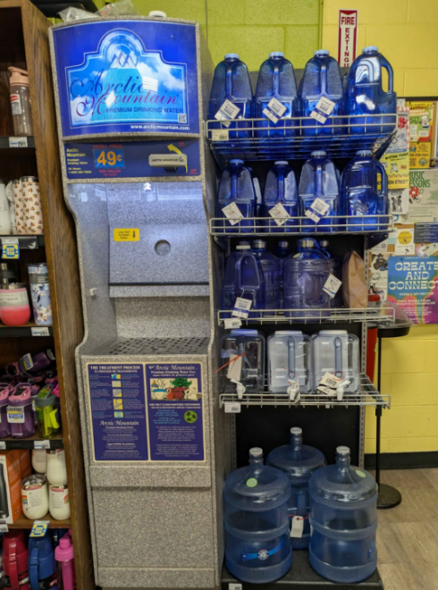 Water refill amenities provide fresh and filtered drinking water. There are reusable containers for sale right next to the water dispenser. This is a great alternative to individual water bottles in a package.