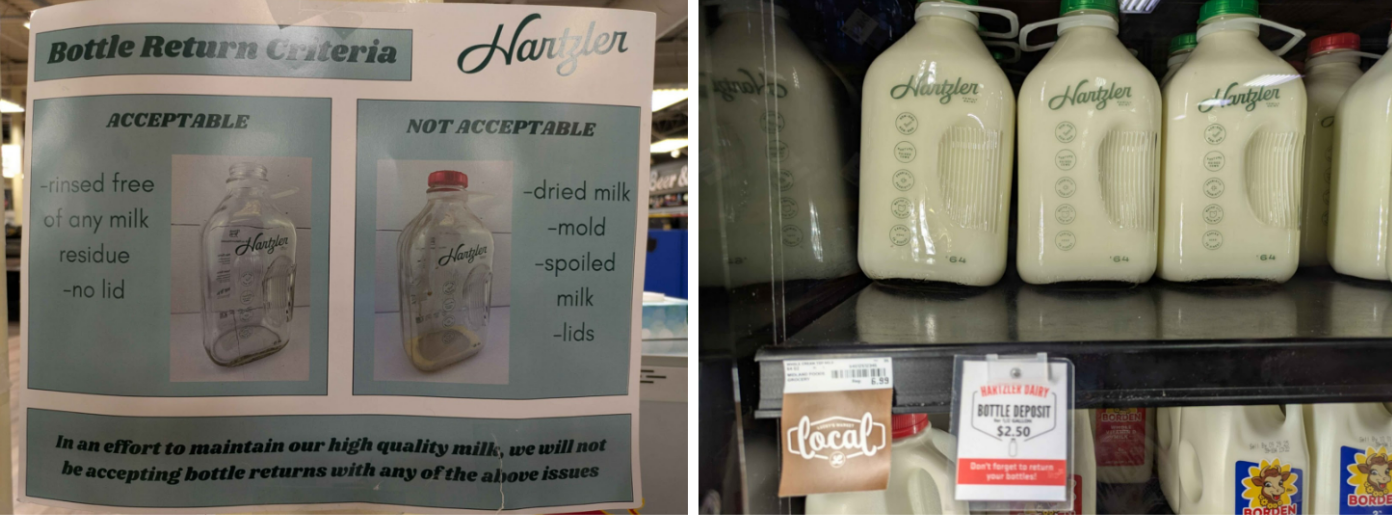 Lastly, there is a unique process being done between Lucky’s, their customers, and a milk company called Harzler that is an example of a circular economy. Milk is sold in reusable milk bottles. Customers buy this milk with an additional deposit charge. After finishing the milk, they clean the containers and return them to Lucky’s to be repaid the deposit. Lucky gets the containers back to Hartzler who refills them with milk to be sold again. Notably this is only done with the large bottle sizes, and they do not accept the caps back.