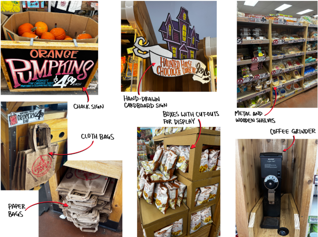 When it came to signs, I was also surprised to see the lack of plastic. Other than the price markers that have a clear plastic sleeve, all other signs are hand-drawn on recycled cardboard or written on chalk. Not only does this completely cut out printing costs, but it also reuses material, and employs artists. The eye-catching signs go well with Trader Joe’s unique branding and chunky vibe. This is completely different from other big store chains like Kroger or Target. I think the visually engaging products and signs are a reason why Trader Joe’s is so popular among young people.