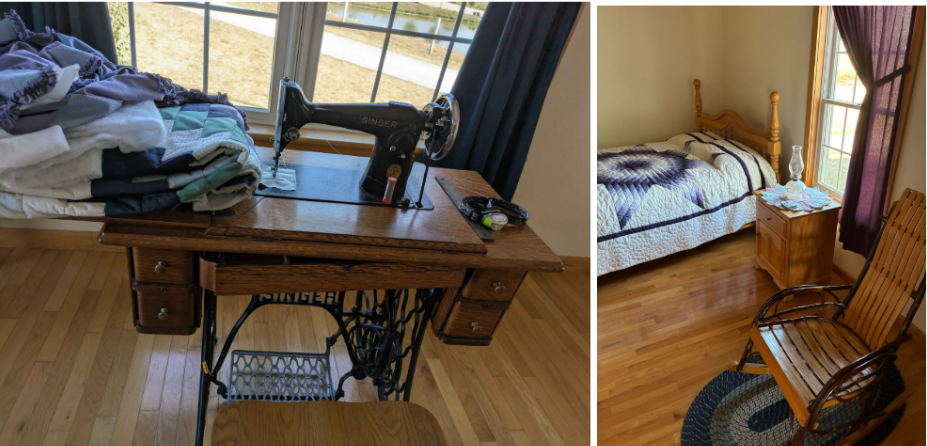 The house itself was open to be explored by guests. Certain aspects were functional for the workers, while some were in place like an exhibit for guests. Materially, all the furnishings were hand-crafted wood from tables to chairs and the quality of the craftsmanship was easy to see. Mock-bedrooms also had wood crafted bedframes, with quilted blankets. An original singer sewing machine was in the middle of a quilting project. Even the public bathrooms had tin stalls for separation, instead of the usual plastic walls. It was easy to see these timeless materials and practices everywhere you looked, even the wooden floors. There was some interesting creep of modernism when taking a closer look, namely the houses themselves. The patios, and stairways leading up to the house, and some railings were new and shiny white made of some sort of plastic material common in newer homes. They were hollow inside, and the material difference was noticeable.