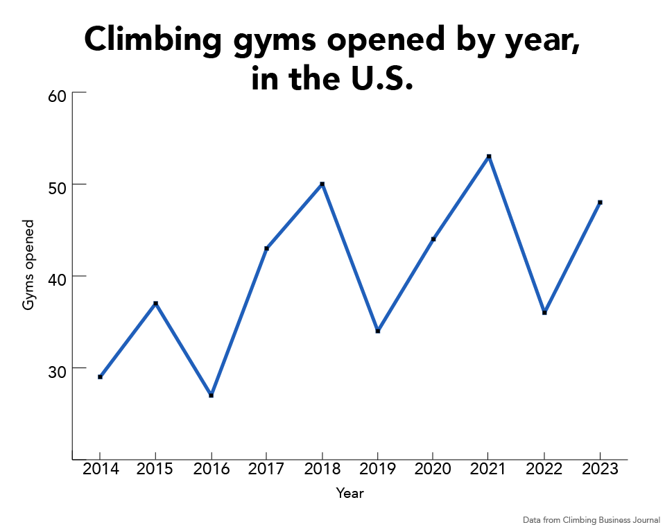 According to the Climbing Business Journal, at the end of 2023, a total of 622 climbing gyms were open in the United States, compared to 353 gyms in 2014. That’s a 76% increase in less than a decade.