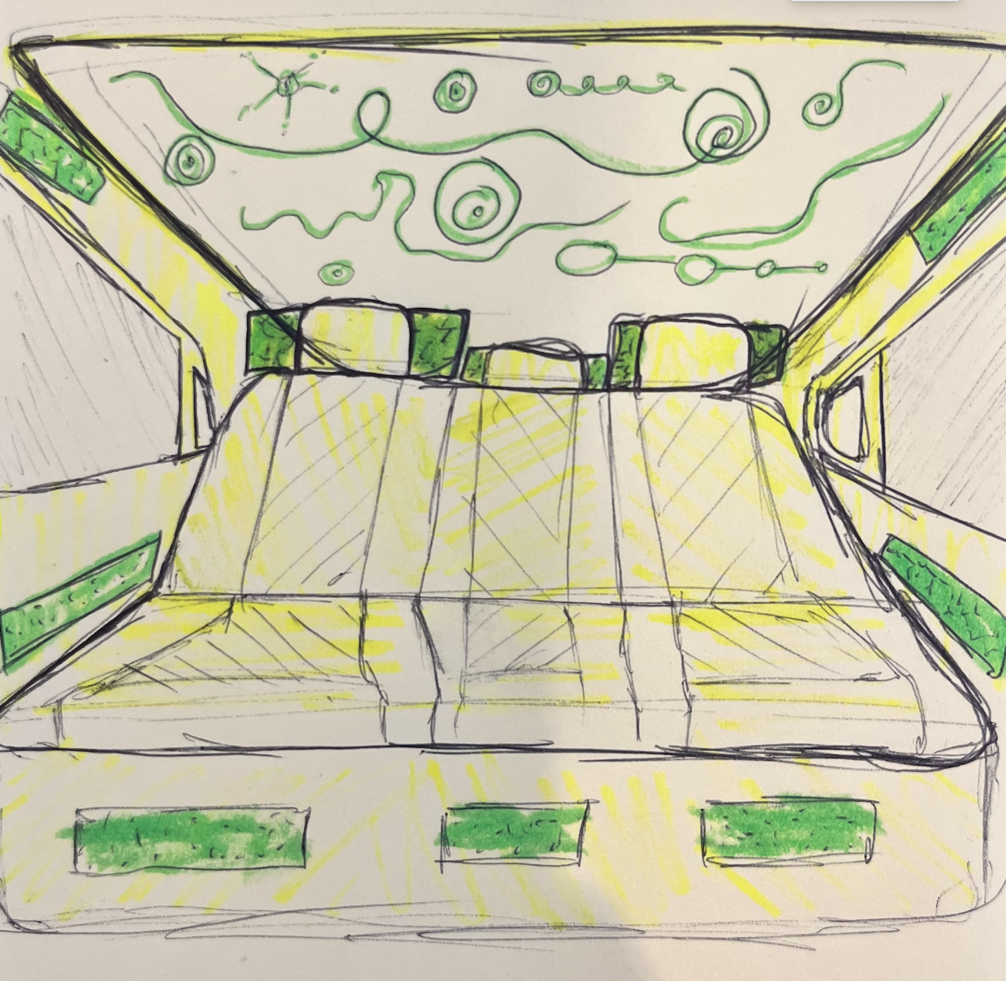 This is a design conjecture for an in car calming experience which integrates 8D audio with soft, flowing shapes on the roof. The shapes work with the sound to guide mindful breathing. It can help distract children and influence a calm down method and maintain focus during car rides. Something to consider is how to balance the sensory elements so they engage children without making them more energetic or a sensory overload. Overall, this design aims to create a meditative backseat environment.