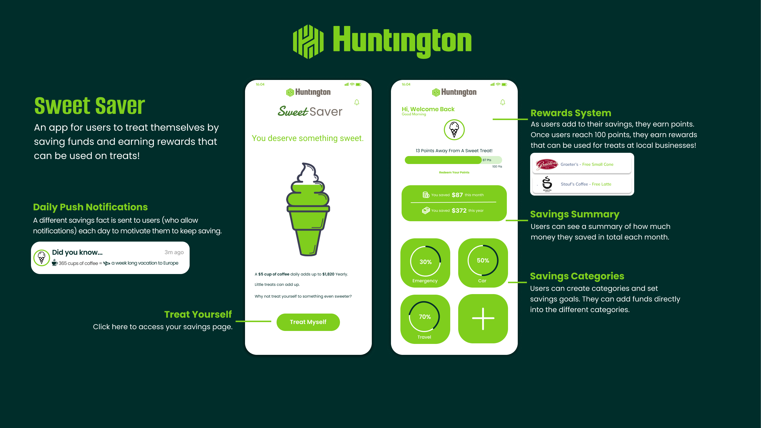 “Sweet Saver” by Huntington is meant to shift treat culture and encourage Gen Z to treat themselves by supporting their goals. When Gen Z feels the desire to reward themselves with treats, they can instead reward themselves by contributing to savings accounts and earn points that can be used towards actual sweet treats. When going on the app, users are prompted with a “treat yourself” button that takes them to a savings page. Users can add different savings categories and add small (or large) amounts to their savings whenever they want the instant gratification of a sweet treat. Every dollar that is saved is a point, and when users reach a hundred points, they receive rewards for treats, such as a free ice cream, coffee, or something else.