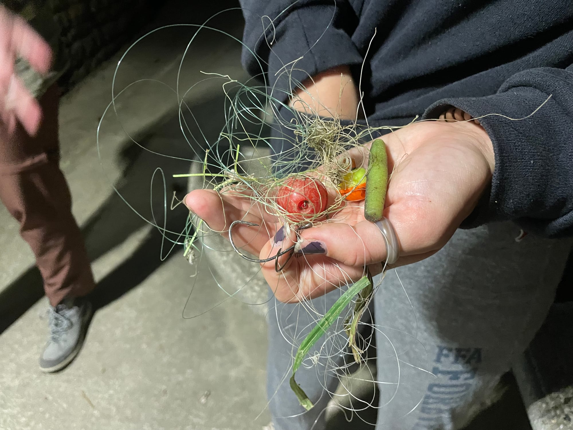 On the hike, we were all surprised at how much trash we found. We saw some spiders, lots of glow worms, and even more garbage. Mostly angler waste--fishing line, hooks, and plastic bait.
