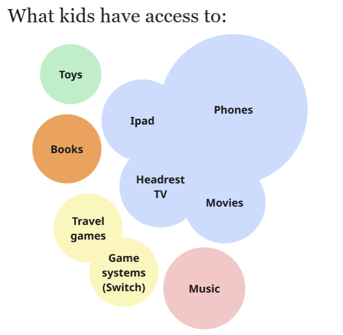 Other information gathered included what things these back seat youths typically have access to. I admit that I was a little surprised at the number of responses that only said phone. Other things that were common included Ipads, music, and headrest TVs/movies.